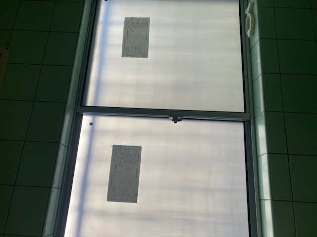 ランマ部は「暗くなってもいい」との事だったので、ブロンズ色のアルミ板をガラス部の前に取り付け四方を木材で止めました。