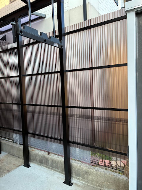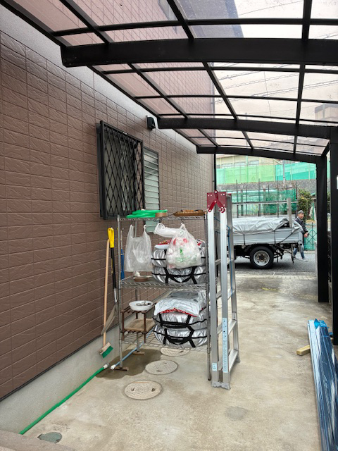 お客様から「カーポートとテラスはなるべく重ねて、雨を入りにくく」との依頼がありましたので、念入りな打ち合わせ後、カーポートとテラスの出幅の角度(家とカーポートの敷地の兼ね合い)が若干違いましたが、うまく重ねて取り付けました。後、隣の田んぼの絡みで側面にパネル取り付けました。自社はできる限り、お客様の依頼を叶えるべく努力します!