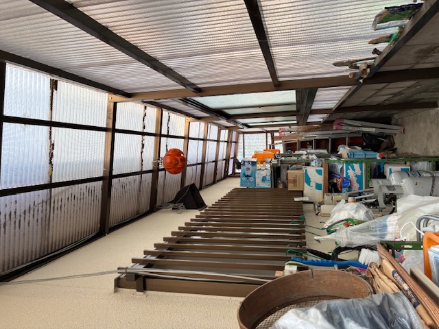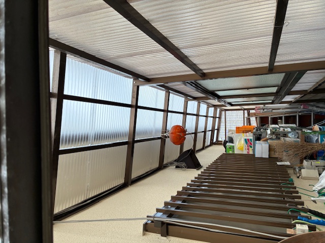 倉庫の屋根の波板張り替えました。ガラス繊維入りの波板から、強度の強いポリカの波板へ。